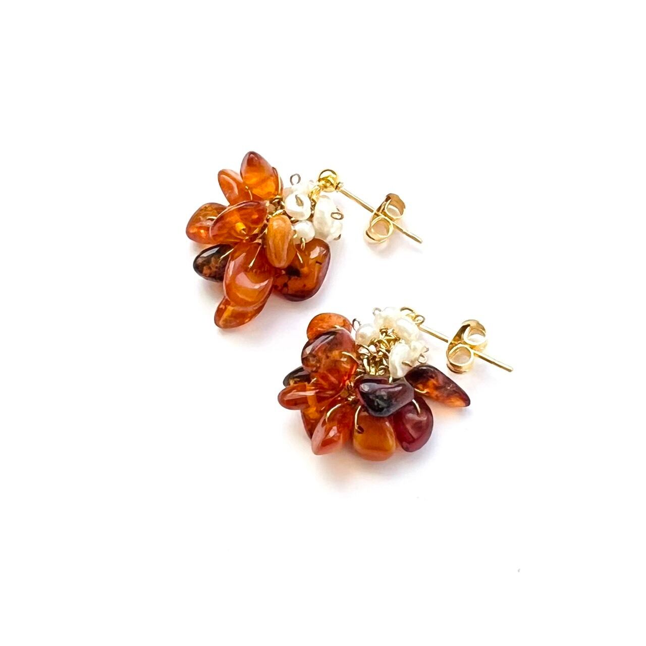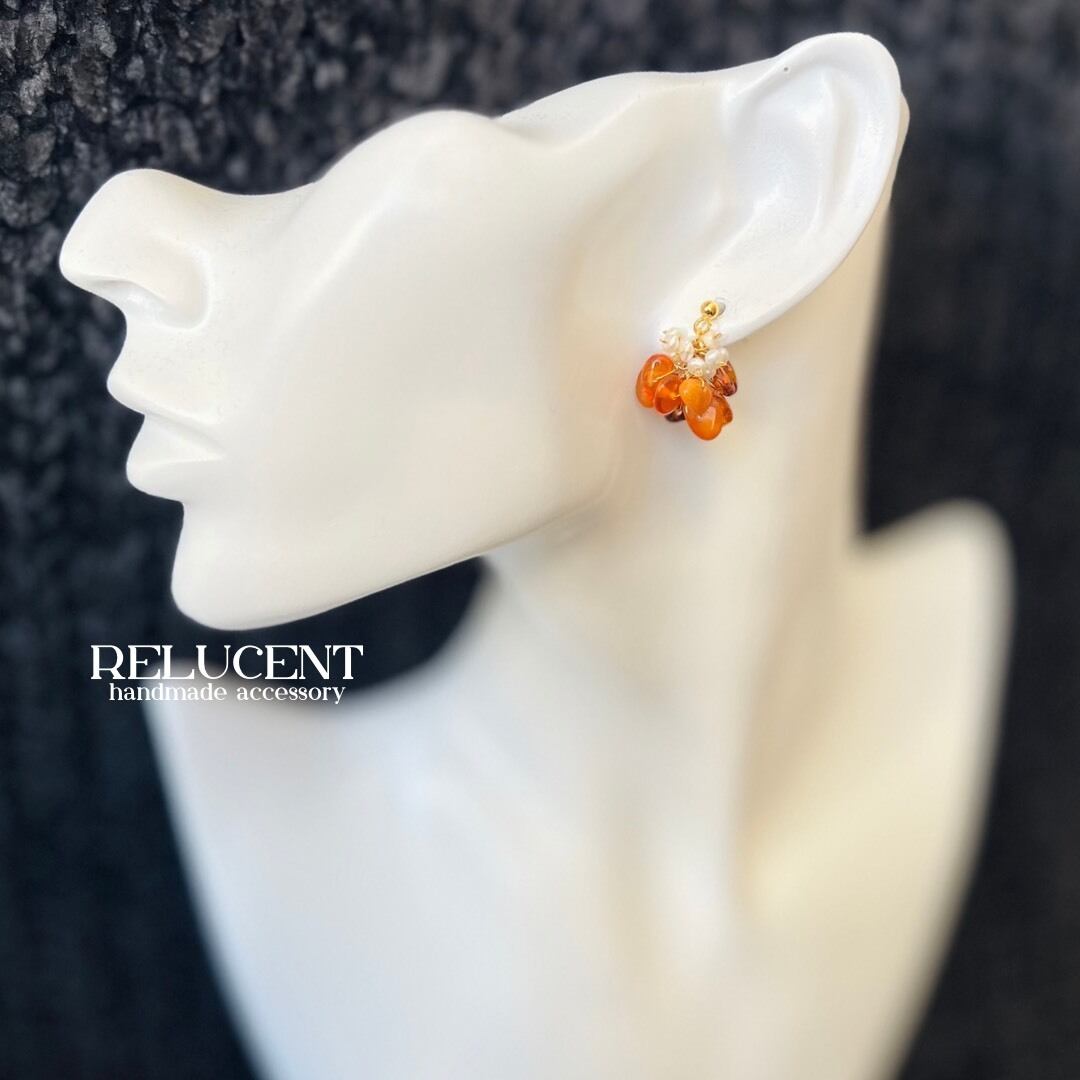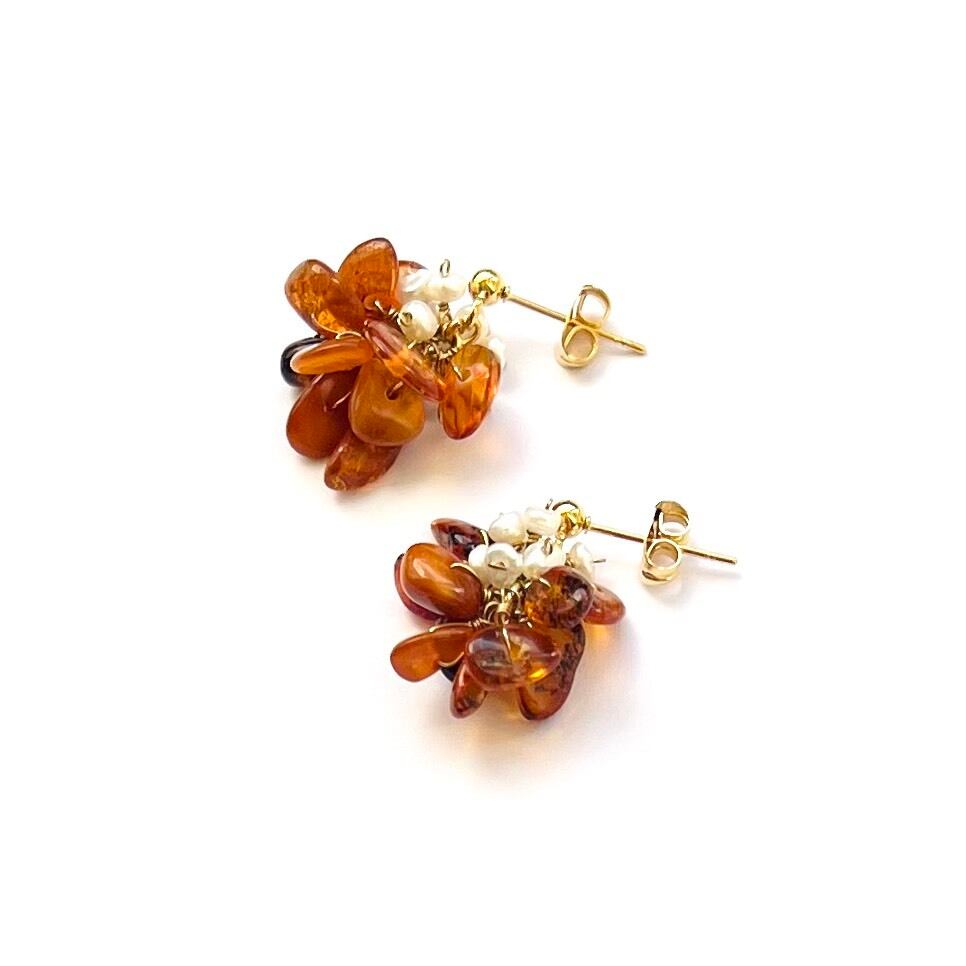 天然石ピアス 琥珀 さざれ × パール サージカルステンレス pierced earrings アンバー 極小パール