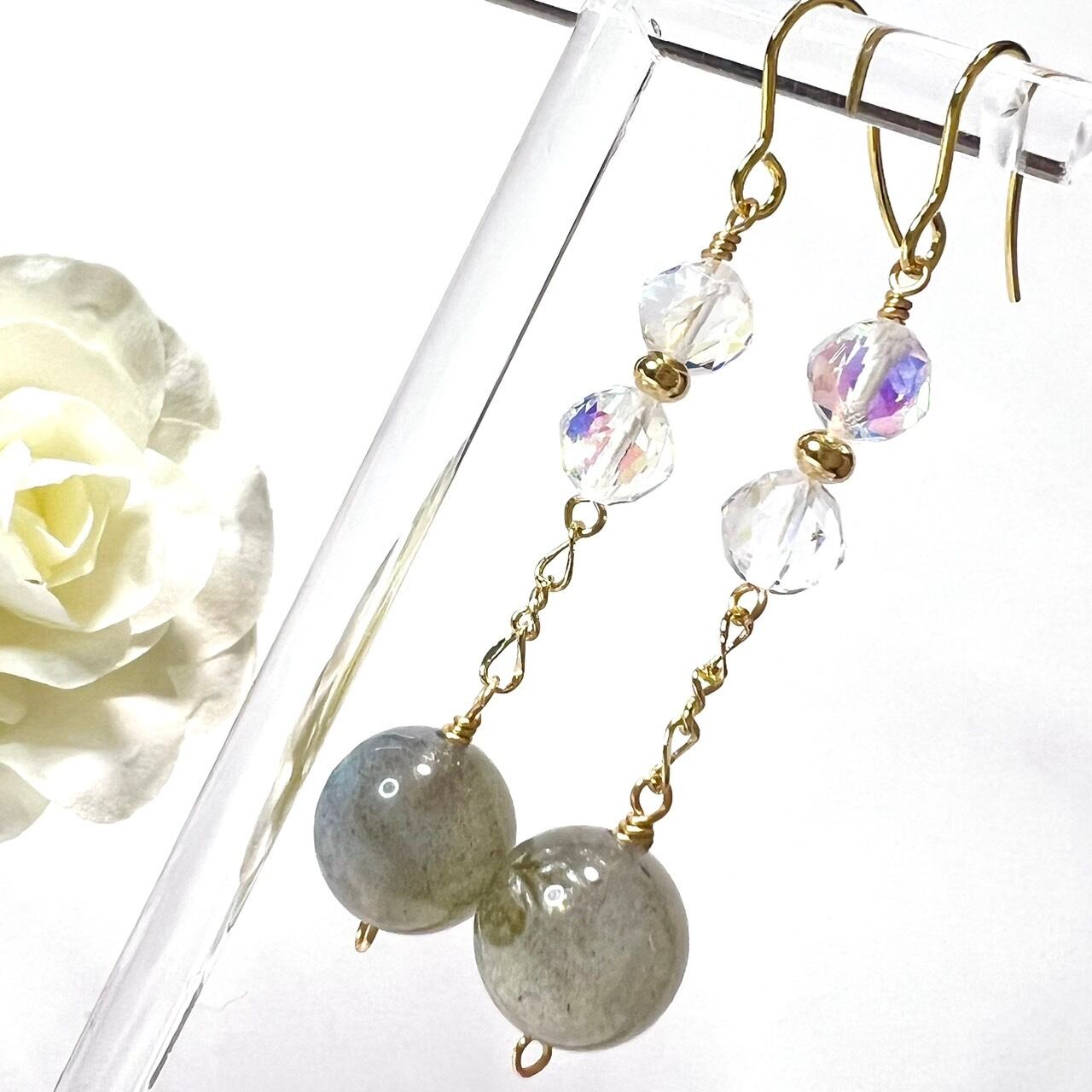 クールなラブラドライトと組み合わせることによって、可愛らしさと大人っぽい上品さもあるピアスとなっております。