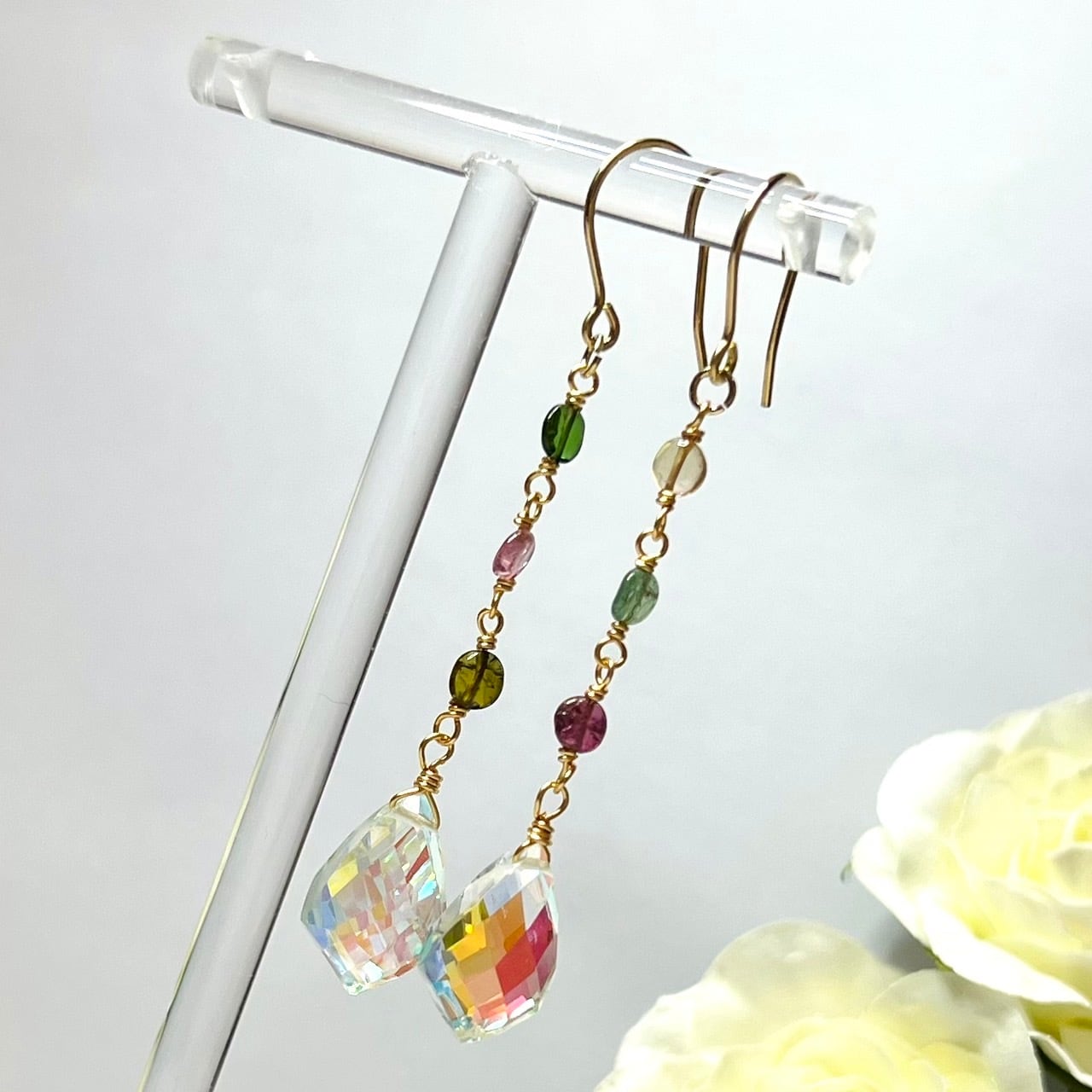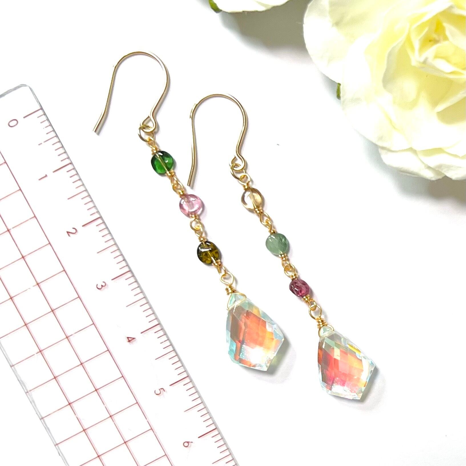 虹色に輝くレインボークォーツとカラフルなマルチカラーのトルマリンのピアス。