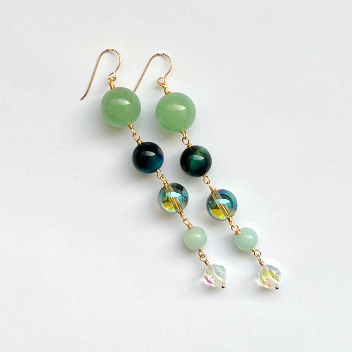 グリーン系の天然石で仕上げた まるまるロングピアスです♪